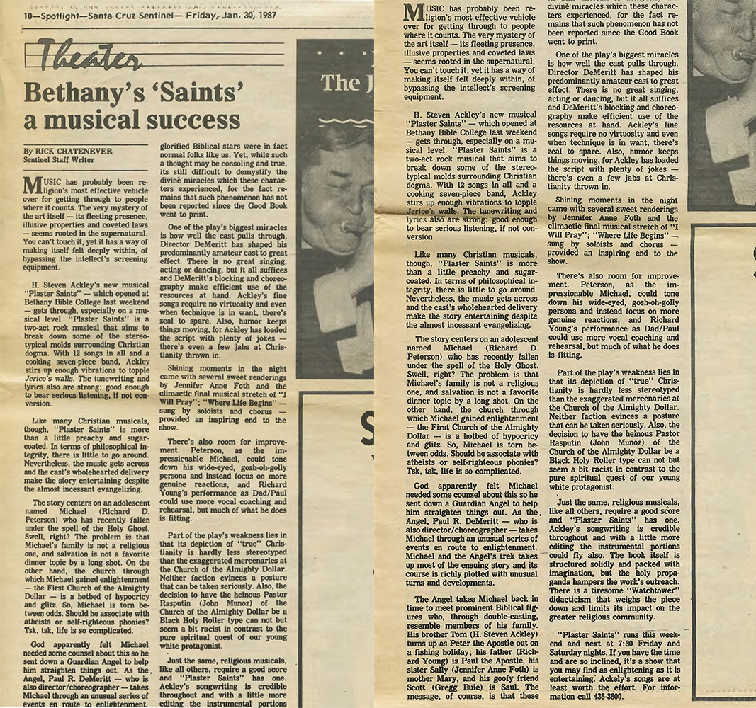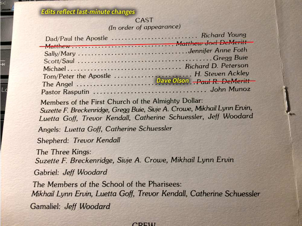 I digitized all the recordings from scratchy and warbly cassette tapes that sat in a box for decades. The sound quality notwithstanding, the music wouldn’t have turned out well at all if it weren’t for all the musicians who helped — all for free, I should add. Thanks to Marv Ellis, for running the recording sessions, to Paul Contos, and Marv again, for their assistance with the horn lines, and to Tom Coyan, for leading the pit band and helping fine-tune the chord changes.